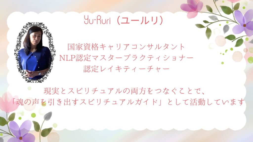 現在は、その学びと体験を生かし、現実とスピリチュアルの両方をつなぐことで「魂の声を引き出すスピリチュアルガイド」として、一人ひとりが自分の本質に気づき、使命を生きられるよう寄り添い支援しています。